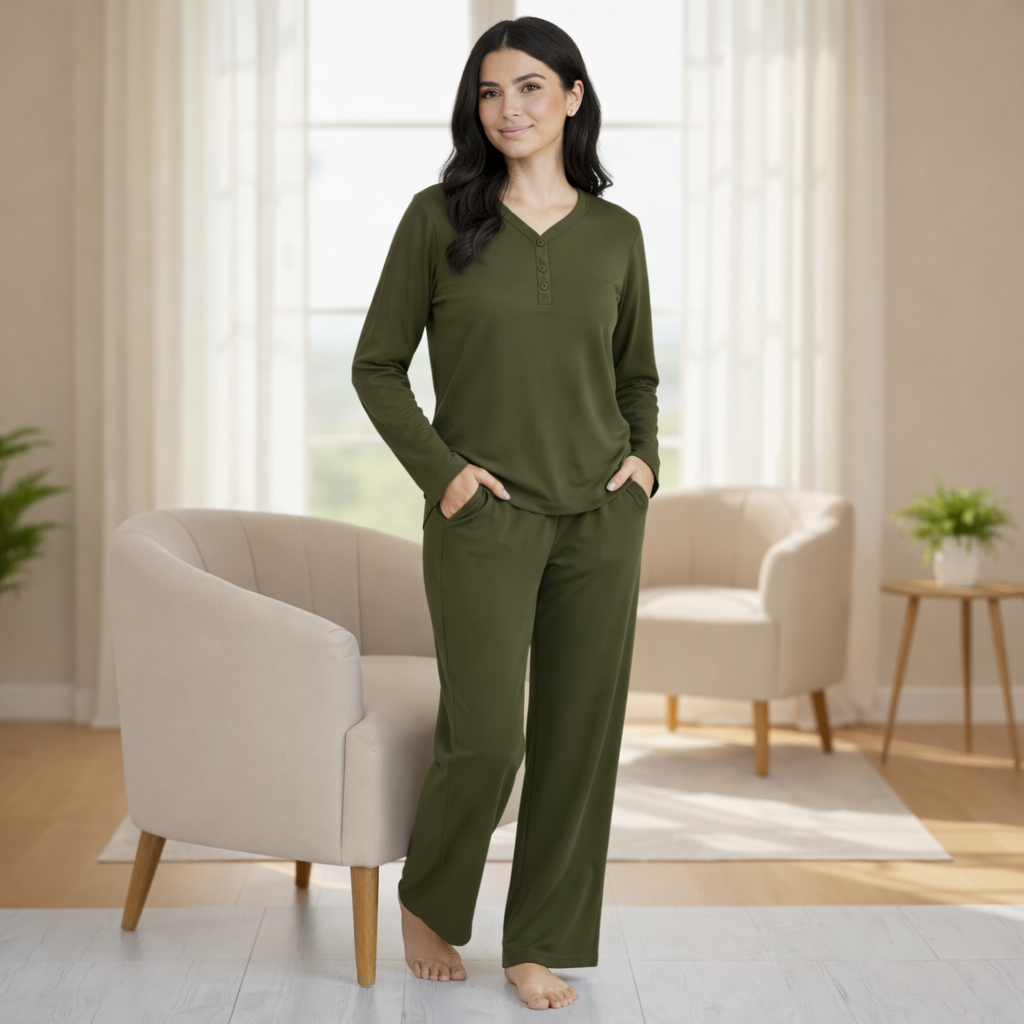 This cotton jersey co-ord set brings comfort and quiet confidence together. Featuring a relaxed long-sleeve top and fluid wide-leg trousers, it’s made to feel easy while looking refined.